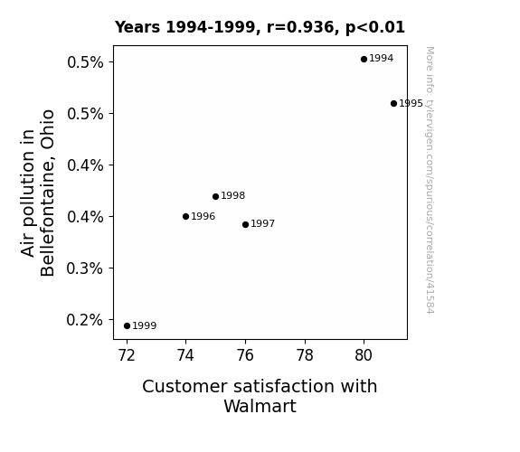 This means 87.5% of the change in the one variable (i.e., Customer satisfaction with Walmart) is predictable based on the change in the other (i.e., Air pollution in Bellefontaine, Ohio) over the 6 years from 1994 through 1999.