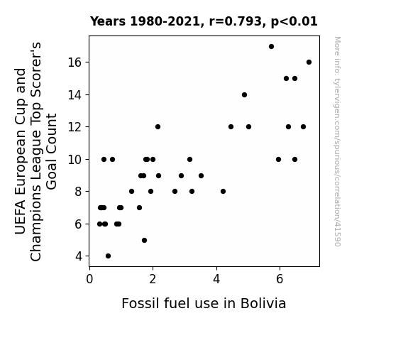 This means 62.9% of the change in the one variable (i.e., Fossil fuel use in Bolivia) is predictable based on the change in the other (i.e., UEFA European Cup and Champions League Top Scorer's Goal Count) over the 42 years from 1980 through 2021.