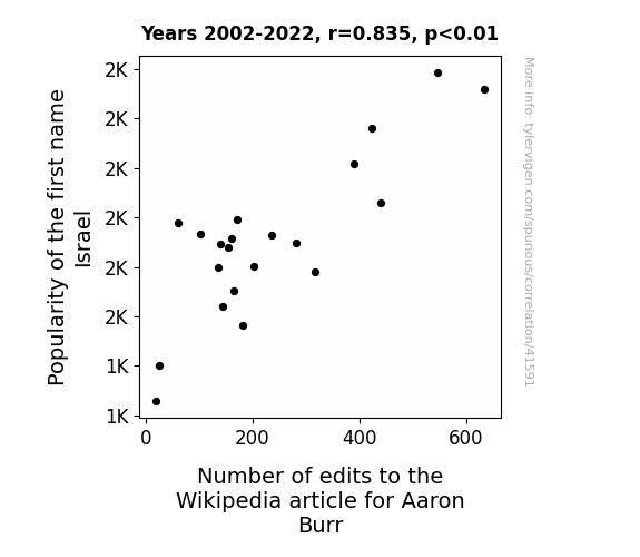 This means 69.7% of the change in the one variable (i.e., Number of edits to the Wikipedia article for Aaron Burr) is predictable based on the change in the other (i.e., Popularity of the first name Israel) over the 21 years from 2002 through 2022.