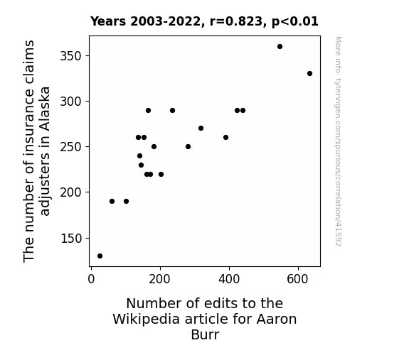 This means 67.7% of the change in the one variable (i.e., Number of edits to the Wikipedia article for Aaron Burr) is predictable based on the change in the other (i.e., The number of insurance claims adjusters in Alaska) over the 20 years from 2003 through 2022.