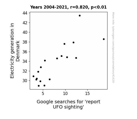 This means 67.3% of the change in the one variable (i.e., Google searches for 'report UFO sighting') is predictable based on the change in the other (i.e., Electricity generation in Denmark) over the 18 years from 2004 through 2021.