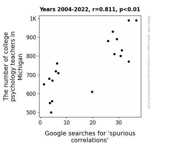 This means 65.7% of the change in the one variable (i.e., Google searches for 'spurious correlations') is predictable based on the change in the other (i.e., The number of college psychology teachers in Michigan) over the 19 years from 2004 through 2022.