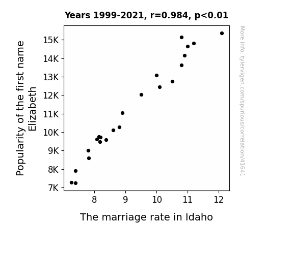 This means 96.7% of the change in the one variable (i.e., The marriage rate in Idaho) is predictable based on the change in the other (i.e., Popularity of the first name Elizabeth) over the 23 years from 1999 through 2021.