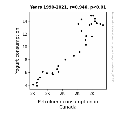 This means 89.6% of the change in the one variable (i.e., Petroluem consumption in Canada) is predictable based on the change in the other (i.e., Yogurt consumption) over the 32 years from 1990 through 2021.
