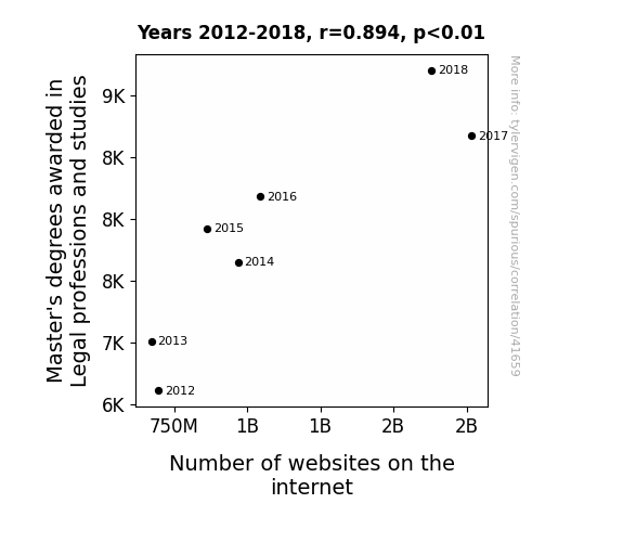 This means 80% of the change in the one variable (i.e., Number of websites on the internet) is predictable based on the change in the other (i.e., Master's degrees awarded in Legal professions and studies) over the 7 years from 2012 through 2018.