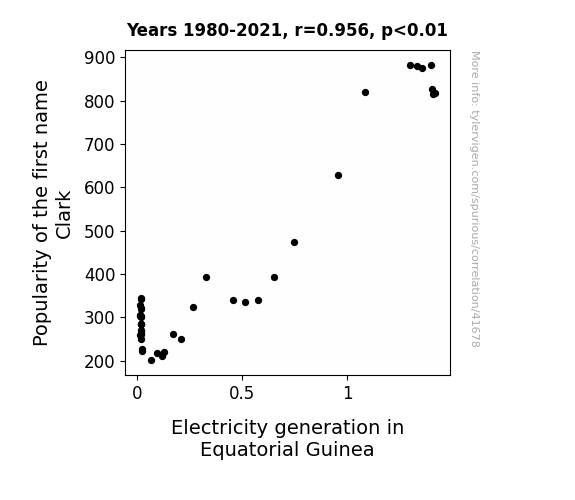 This means 91.4% of the change in the one variable (i.e., Electricity generation in Equatorial Guinea) is predictable based on the change in the other (i.e., Popularity of the first name Clark) over the 42 years from 1980 through 2021.
