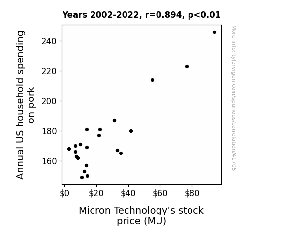 This means 80% of the change in the one variable (i.e., Micron Technology's stock price (MU)) is predictable based on the change in the other (i.e., Annual US household spending on pork) over the 21 years from 2002 through 2022.