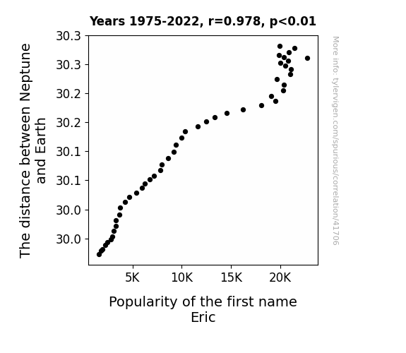 This means 95.7% of the change in the one variable (i.e., Popularity of the first name Eric) is predictable based on the change in the other (i.e., The distance between Neptune and Earth) over the 48 years from 1975 through 2022.