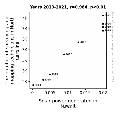 This means 96.8% of the change in the one variable (i.e., Solar power generated in Kuwait) is predictable based on the change in the other (i.e., The number of surveying and mapping technicians in North Carolina) over the 9 years from 2013 through 2021.