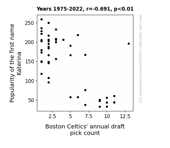 This means 47.7% of the change in the one variable (i.e., Boston Celtics' annual draft pick count) is predictable based on the change in the other (i.e., Popularity of the first name Katerina) over the 48 years from 1975 through 2022.