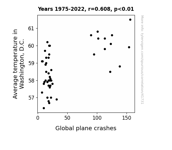 This means 37% of the change in the one variable (i.e., Global plane crashes) is predictable based on the change in the other (i.e., Average temperature in Washington, D.C.) over the 48 years from 1975 through 2022.