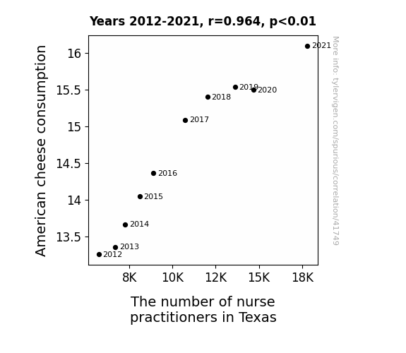 This means 92.9% of the change in the one variable (i.e., The number of nurse practitioners in Texas) is predictable based on the change in the other (i.e., American cheese consumption) over the 10 years from 2012 through 2021.