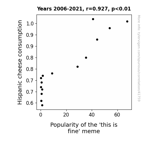 This means 86% of the change in the one variable (i.e., Popularity of the 'this is fine' meme) is predictable based on the change in the other (i.e., Hispanic cheese consumption) over the 16 years from 2006 through 2021.