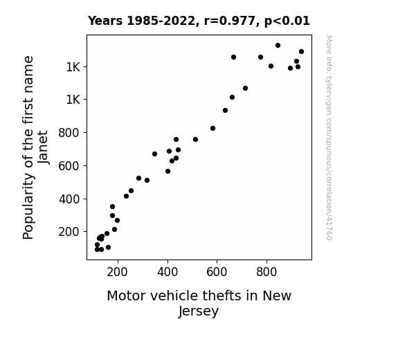 This means 95.5% of the change in the one variable (i.e., Motor vehicle thefts in New Jersey) is predictable based on the change in the other (i.e., Popularity of the first name Janet) over the 38 years from 1985 through 2022.