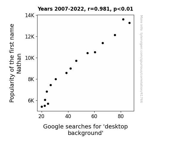 This means 96.2% of the change in the one variable (i.e., Google searches for 'desktop background') is predictable based on the change in the other (i.e., Popularity of the first name Nathan) over the 16 years from 2007 through 2022.