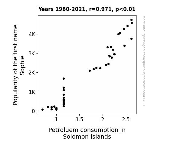 This means 94.3% of the change in the one variable (i.e., Petroluem consumption in Solomon Islands) is predictable based on the change in the other (i.e., Popularity of the first name Sophie) over the 42 years from 1980 through 2021.