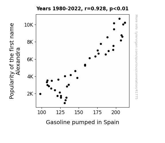 This means 86.1% of the change in the one variable (i.e., Gasoline pumped in Spain) is predictable based on the change in the other (i.e., Popularity of the first name Alexandra) over the 43 years from 1980 through 2022.