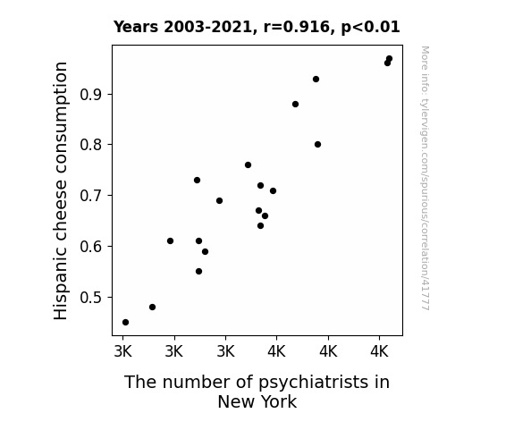 This means 83.8% of the change in the one variable (i.e., The number of psychiatrists in New York) is predictable based on the change in the other (i.e., Hispanic cheese consumption) over the 19 years from 2003 through 2021.