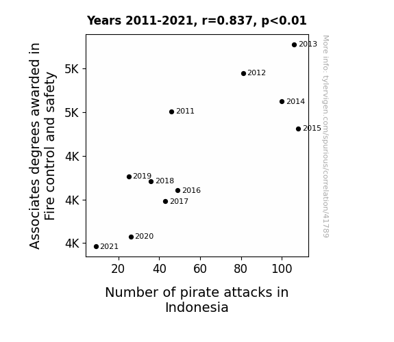 This means 70% of the change in the one variable (i.e., Number of pirate attacks in Indonesia) is predictable based on the change in the other (i.e., Associates degrees awarded in Fire control and safety) over the 11 years from 2011 through 2021.