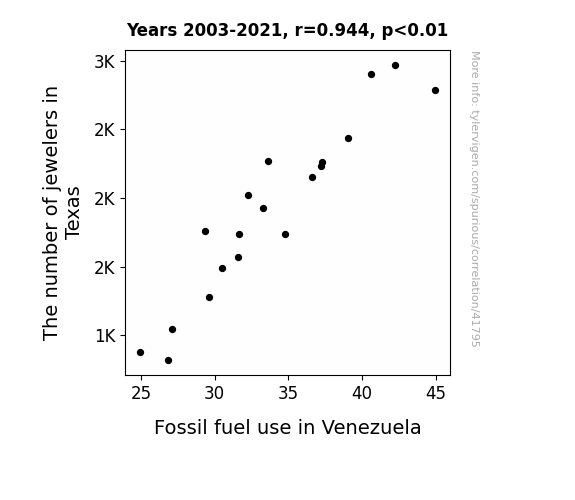 This means 89.2% of the change in the one variable (i.e., Fossil fuel use in Venezuela) is predictable based on the change in the other (i.e., The number of jewelers in Texas) over the 19 years from 2003 through 2021.