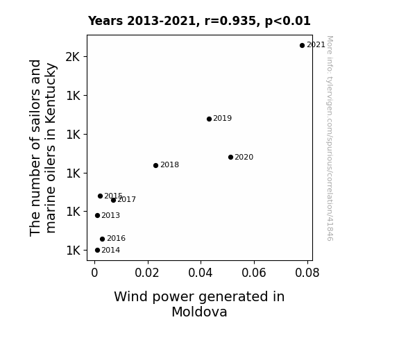 This means 87.5% of the change in the one variable (i.e., Wind power generated in Moldova) is predictable based on the change in the other (i.e., The number of sailors and marine oilers in Kentucky) over the 9 years from 2013 through 2021.