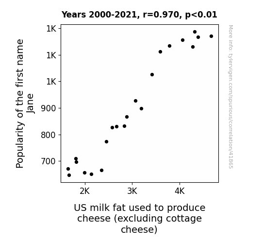 This means 94.1% of the change in the one variable (i.e., US milk fat used to produce cheese (excluding cottage cheese)) is predictable based on the change in the other (i.e., Popularity of the first name Jane) over the 22 years from 2000 through 2021.