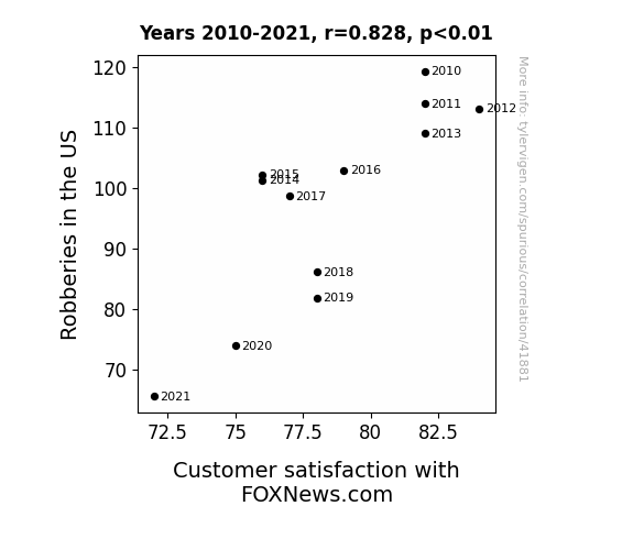 This means 68.6% of the change in the one variable (i.e., Customer satisfaction with FOXNews.com) is predictable based on the change in the other (i.e., Robberies in the US) over the 12 years from 2010 through 2021.