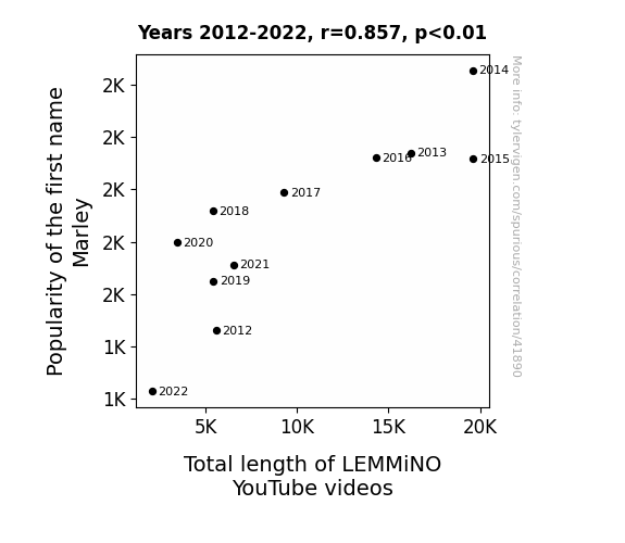This means 73.5% of the change in the one variable (i.e., Total length of LEMMiNO YouTube videos) is predictable based on the change in the other (i.e., Popularity of the first name Marley) over the 11 years from 2012 through 2022.