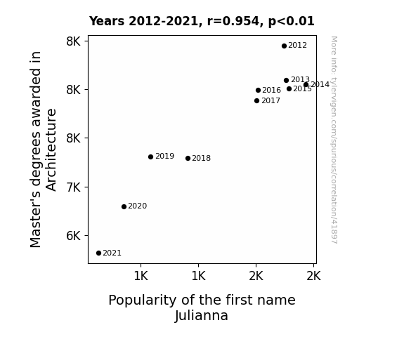 This means 91% of the change in the one variable (i.e., Popularity of the first name Julianna) is predictable based on the change in the other (i.e., Master's degrees awarded in Architecture) over the 10 years from 2012 through 2021.