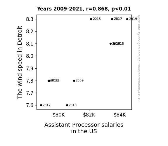 This means 75.4% of the change in the one variable (i.e., Assistant Processor salaries in the US) is predictable based on the change in the other (i.e., The wind speed in Detroit) over the 11 years from 2009 through 2021.