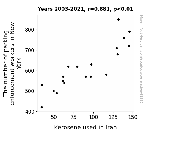 This means 77.6% of the change in the one variable (i.e., Kerosene used in Iran) is predictable based on the change in the other (i.e., The number of parking enforcement workers in New York) over the 19 years from 2003 through 2021.