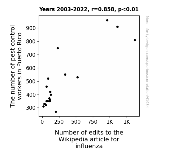 This means 73.6% of the change in the one variable (i.e., Number of edits to the Wikipedia article for influenza) is predictable based on the change in the other (i.e., The number of pest control workers in Puerto Rico) over the 20 years from 2003 through 2022.