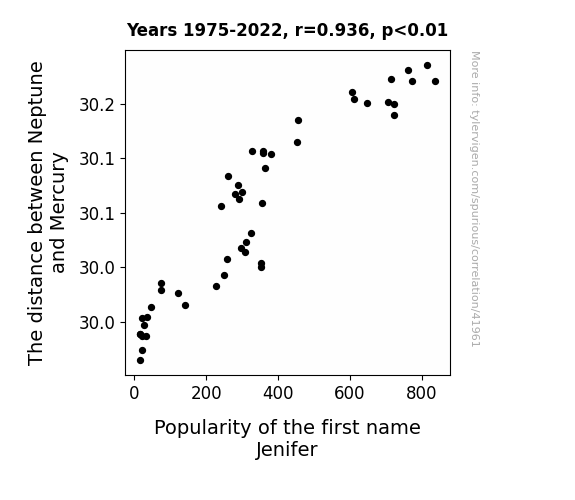 This means 87.6% of the change in the one variable (i.e., Popularity of the first name Jenifer) is predictable based on the change in the other (i.e., The distance between Neptune and Mercury) over the 48 years from 1975 through 2022.