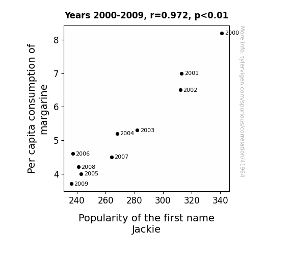 This means 94.5% of the change in the one variable (i.e., Popularity of the first name Jackie) is predictable based on the change in the other (i.e., Per capita consumption of margarine) over the 10 years from 2000 through 2009.