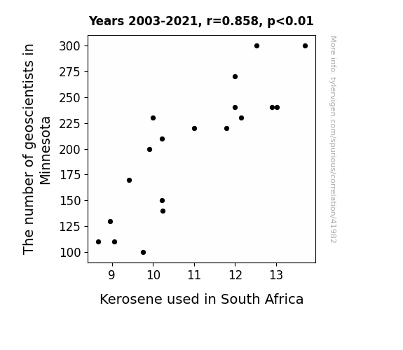 This means 73.6% of the change in the one variable (i.e., Kerosene used in South Africa) is predictable based on the change in the other (i.e., The number of geoscientists in Minnesota) over the 19 years from 2003 through 2021.