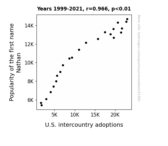 This means 93.3% of the change in the one variable (i.e., U.S. intercountry adoptions) is predictable based on the change in the other (i.e., Popularity of the first name Nathan) over the 23 years from 1999 through 2021.