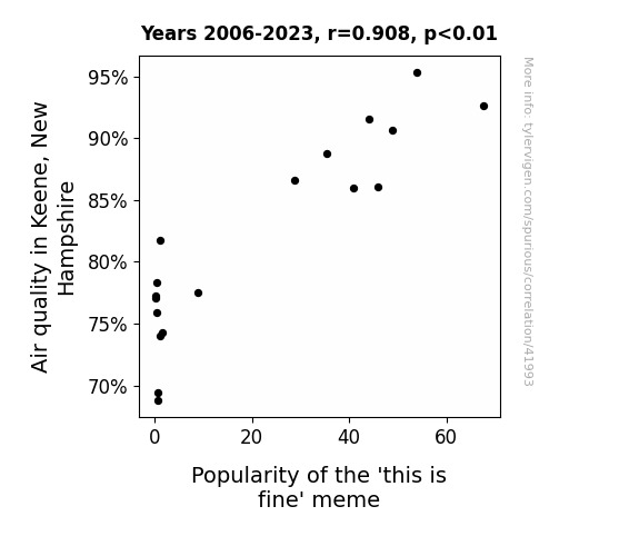 This means 82.4% of the change in the one variable (i.e., Popularity of the 'this is fine' meme) is predictable based on the change in the other (i.e., Air quality in Keene, New Hampshire) over the 18 years from 2006 through 2023.
