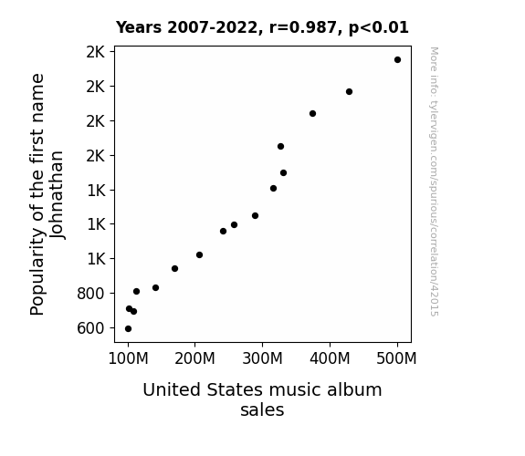 This means 97.5% of the change in the one variable (i.e., United States music album sales) is predictable based on the change in the other (i.e., Popularity of the first name Johnathan) over the 16 years from 2007 through 2022.