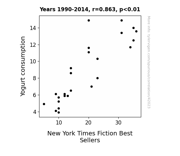 This means 74.6% of the change in the one variable (i.e., New York Times Fiction Best Sellers) is predictable based on the change in the other (i.e., Yogurt consumption) over the 25 years from 1990 through 2014.