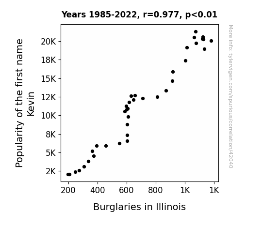 This means 95.5% of the change in the one variable (i.e., Burglaries in Illinois) is predictable based on the change in the other (i.e., Popularity of the first name Kevin) over the 38 years from 1985 through 2022.