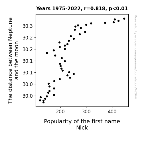 This means 66.8% of the change in the one variable (i.e., Popularity of the first name Nick) is predictable based on the change in the other (i.e., The distance between Neptune and the moon) over the 48 years from 1975 through 2022.