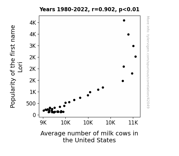 This means 81.3% of the change in the one variable (i.e., Average number of milk cows in the United States) is predictable based on the change in the other (i.e., Popularity of the first name Lori) over the 43 years from 1980 through 2022.