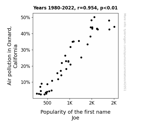 This means 91% of the change in the one variable (i.e., Popularity of the first name Joe) is predictable based on the change in the other (i.e., Air pollution in Oxnard, California) over the 43 years from 1980 through 2022.