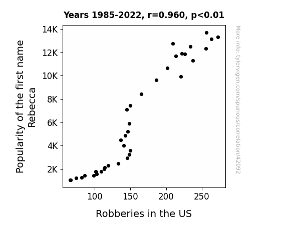 This means 92.2% of the change in the one variable (i.e., Robberies in the US) is predictable based on the change in the other (i.e., Popularity of the first name Rebecca) over the 38 years from 1985 through 2022.