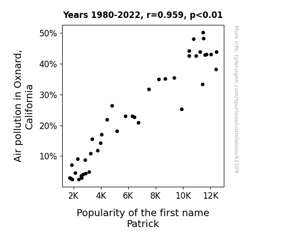 This means 92% of the change in the one variable (i.e., Popularity of the first name Patrick) is predictable based on the change in the other (i.e., Air pollution in Oxnard, California) over the 43 years from 1980 through 2022.