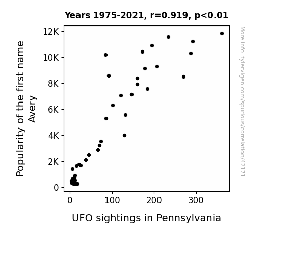 This means 84.4% of the change in the one variable (i.e., UFO sightings in Pennsylvania) is predictable based on the change in the other (i.e., Popularity of the first name Avery) over the 47 years from 1975 through 2021.