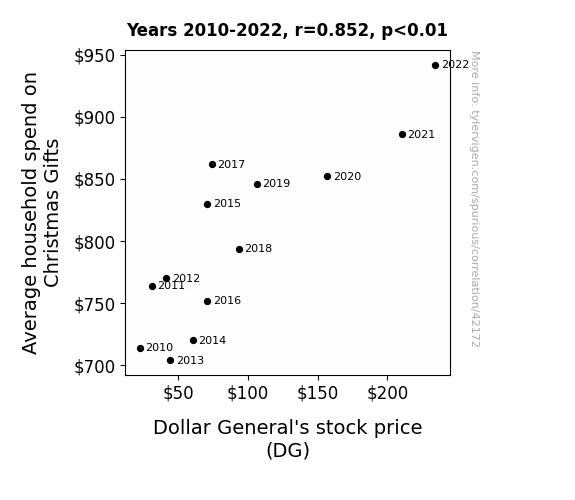 This means 72.7% of the change in the one variable (i.e., Dollar General's stock price (DG)) is predictable based on the change in the other (i.e., Average household spend on Christmas Gifts) over the 13 years from 2010 through 2022.
