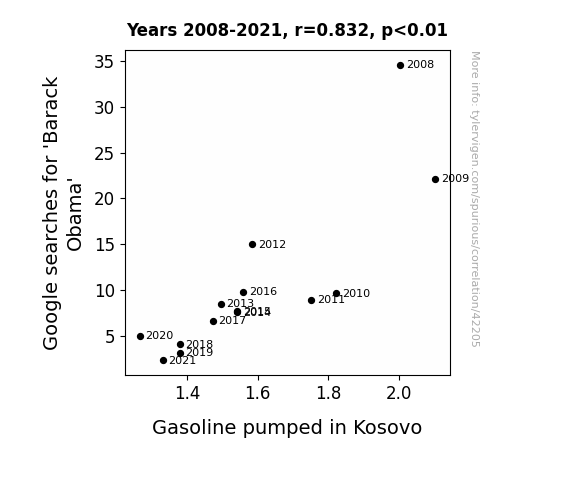 This means 69.3% of the change in the one variable (i.e., Gasoline pumped in Kosovo) is predictable based on the change in the other (i.e., Google searches for 'Barack Obama') over the 14 years from 2008 through 2021.