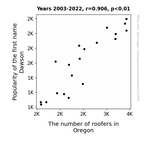 This means 82.1% of the change in the one variable (i.e., The number of roofers in Oregon) is predictable based on the change in the other (i.e., Popularity of the first name Dawson) over the 20 years from 2003 through 2022.