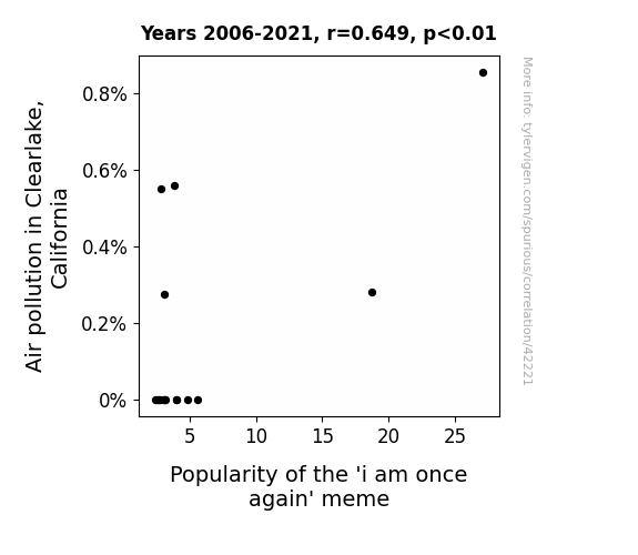 This means 42.1% of the change in the one variable (i.e., Popularity of the 'i am once again' meme) is predictable based on the change in the other (i.e., Air pollution in Clearlake, California) over the 16 years from 2006 through 2021.